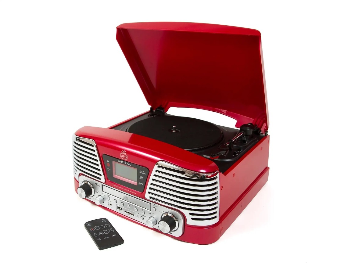 De GPO Memphis is een prachtig muziek center met een retro uitstraling. Dit complete apparaat combineert een CD-speler, platenspeler en radio, waardoor je kunt genieten van al je favoriete muziek op één plek. Achter de chroomkleurige grill zijn de ingebouwde speakers verborgen, waardoor het niet nodig is om extra speakers aan te sluiten. Voor een nog voller geluid kun je echter de GPO Westwood speakers toevoegen. Met de GPO Memphis kun je niet alleen naar muziek luisteren, maar ook je geliefde muziek direct opnemen op een USB-stick of SD-kaart.
